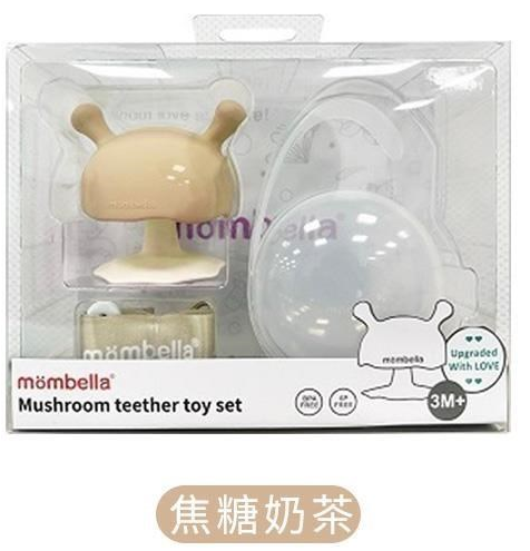 英國 mombella 啾比小蘑菇固齒器組合 焦糖奶茶 (蘑菇*1+收納盒*1+防掉繩*1)