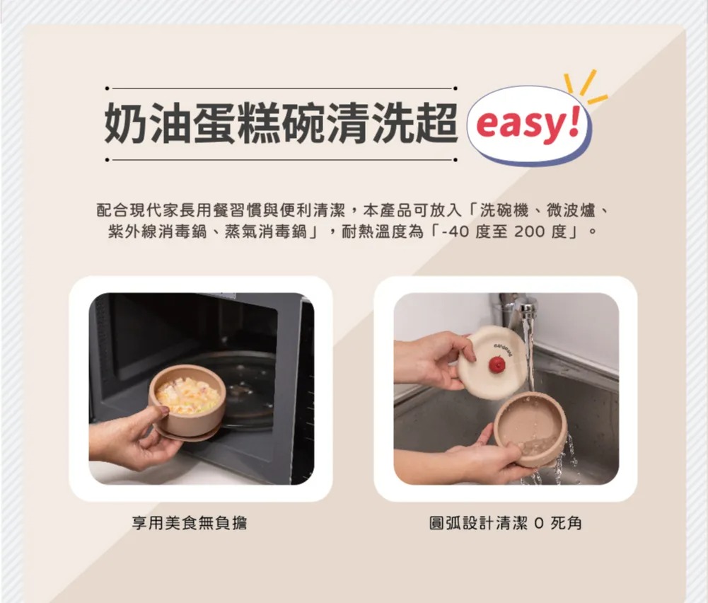 .配合現代爸媽的用餐習慣與便利清潔工具,本產品可放入「洗碗機、微波爐、紫外線消毒鍋、蒸氣消毒鍋」耐熱溫度為「-40度至200度」