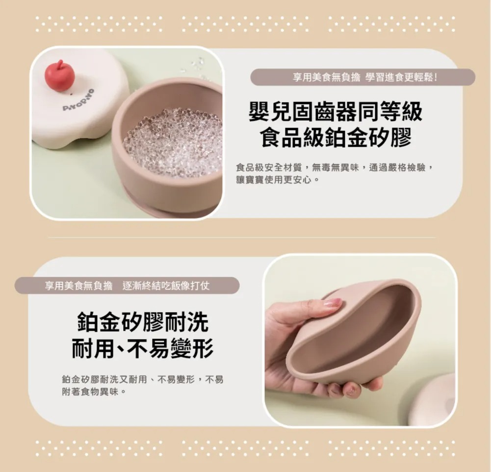嬰兒固齒器等級!材質安全無毒無異味、無懼寶寶啃咬,讓寶寶吃下肚的每一口都安心;鉑金矽膠耐洗耐用,經受拉扯不易變形,透氣性佳且不易附著食物異味。
