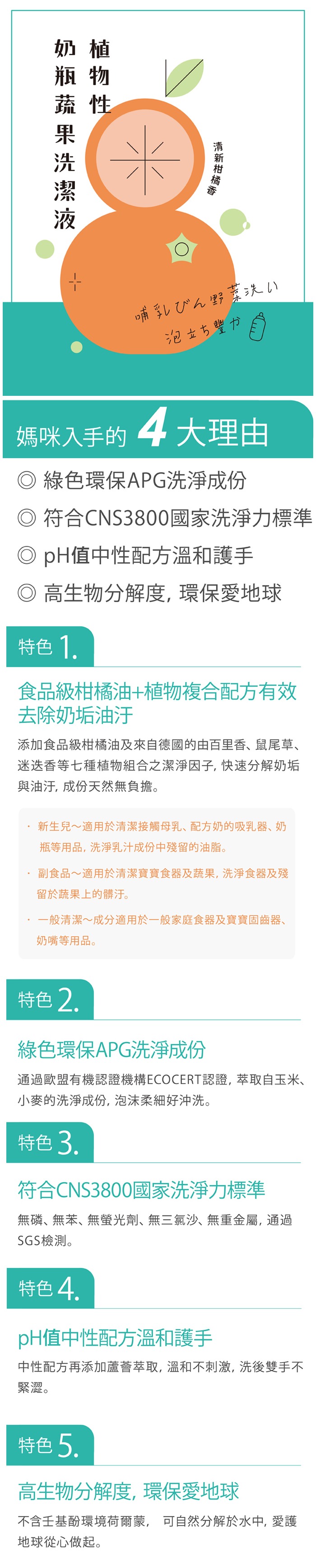 - ECOCERT與FDA 歐美雙認證 APG綠色洗淨成分,可安心用來清洗水果、蔬菜、食器與嬰兒奶瓶,奶嘴等。