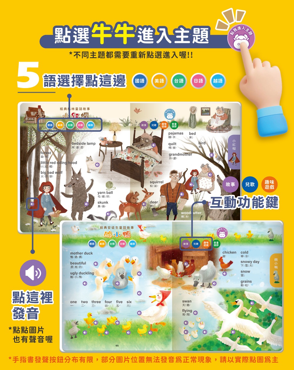 ●用手指點一點!12篇精選故事、160組五語詞彙、60個趣味遊戲、30首曲目