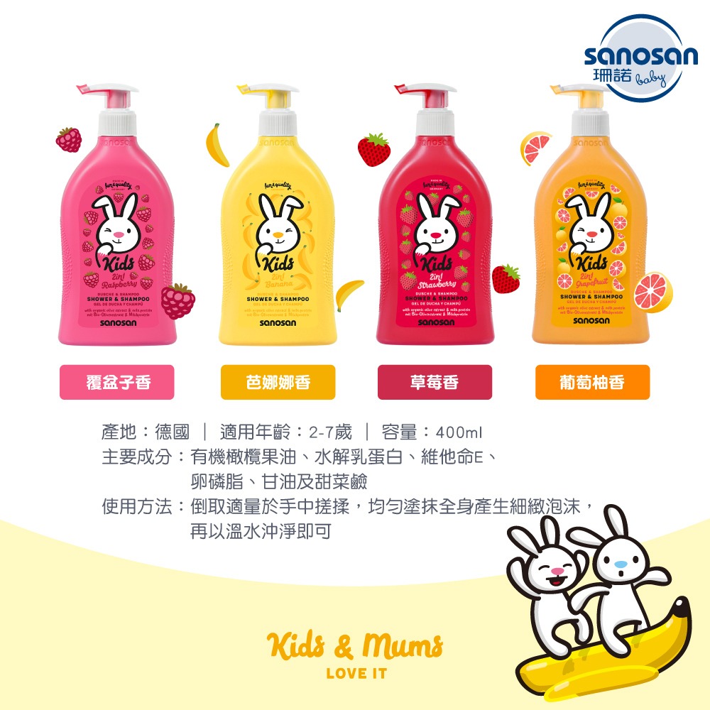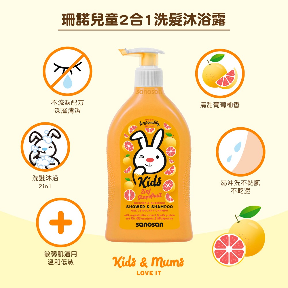 ‧溫和成分設計及細緻柔順泡沫,溫和洗淨寶貝肌膚及髮絲,洗髮沐浴二合一,葡萄柚香芬,讓洗澡快樂又有趣!