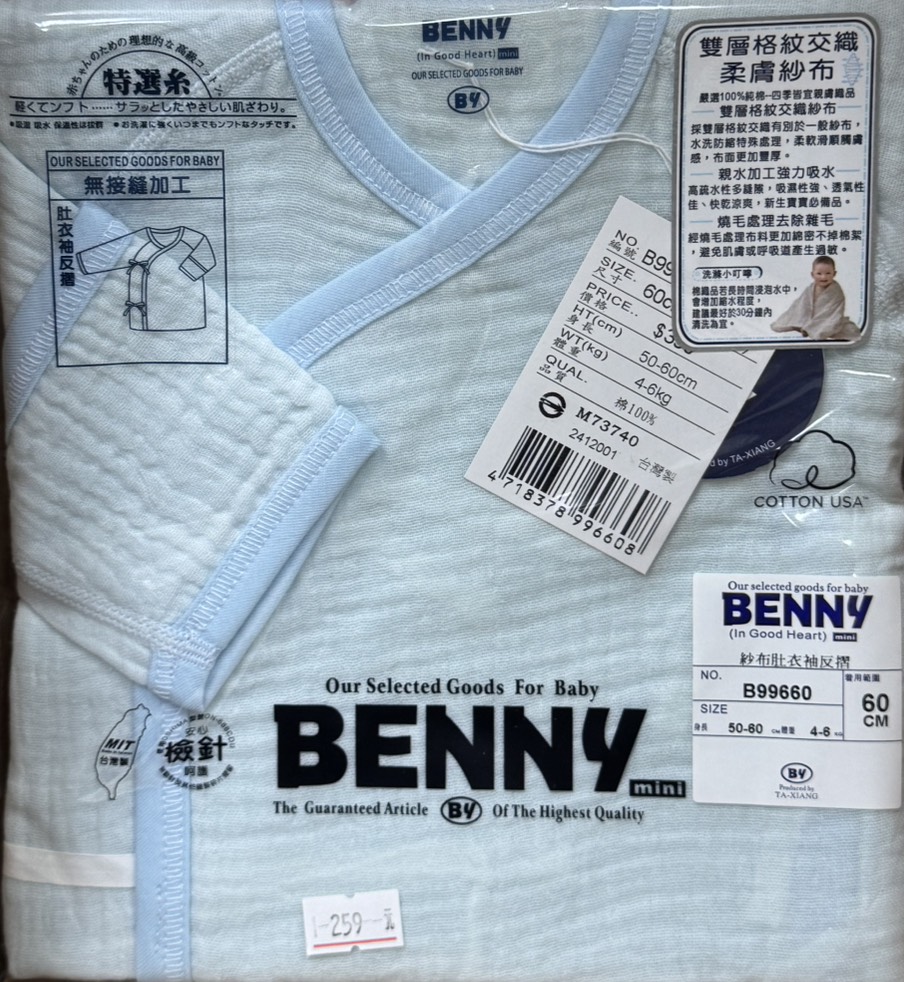 BENNY 紗布肚衣式包屁袖反摺 皺皺紗 60cm B9960 (水)