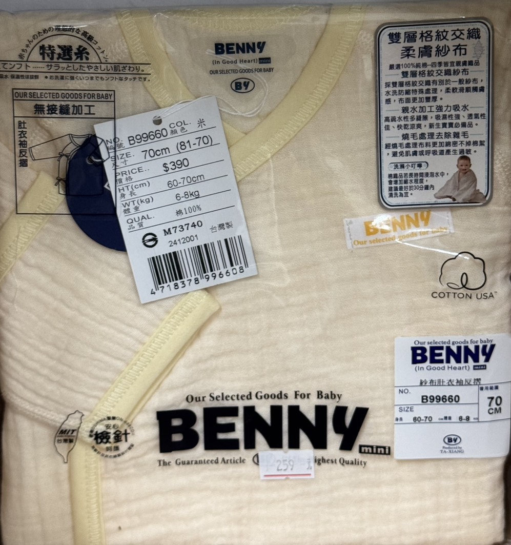 BENNY 紗布肚衣式包屁袖反摺 皺皺紗 70cm B99660 (黃)