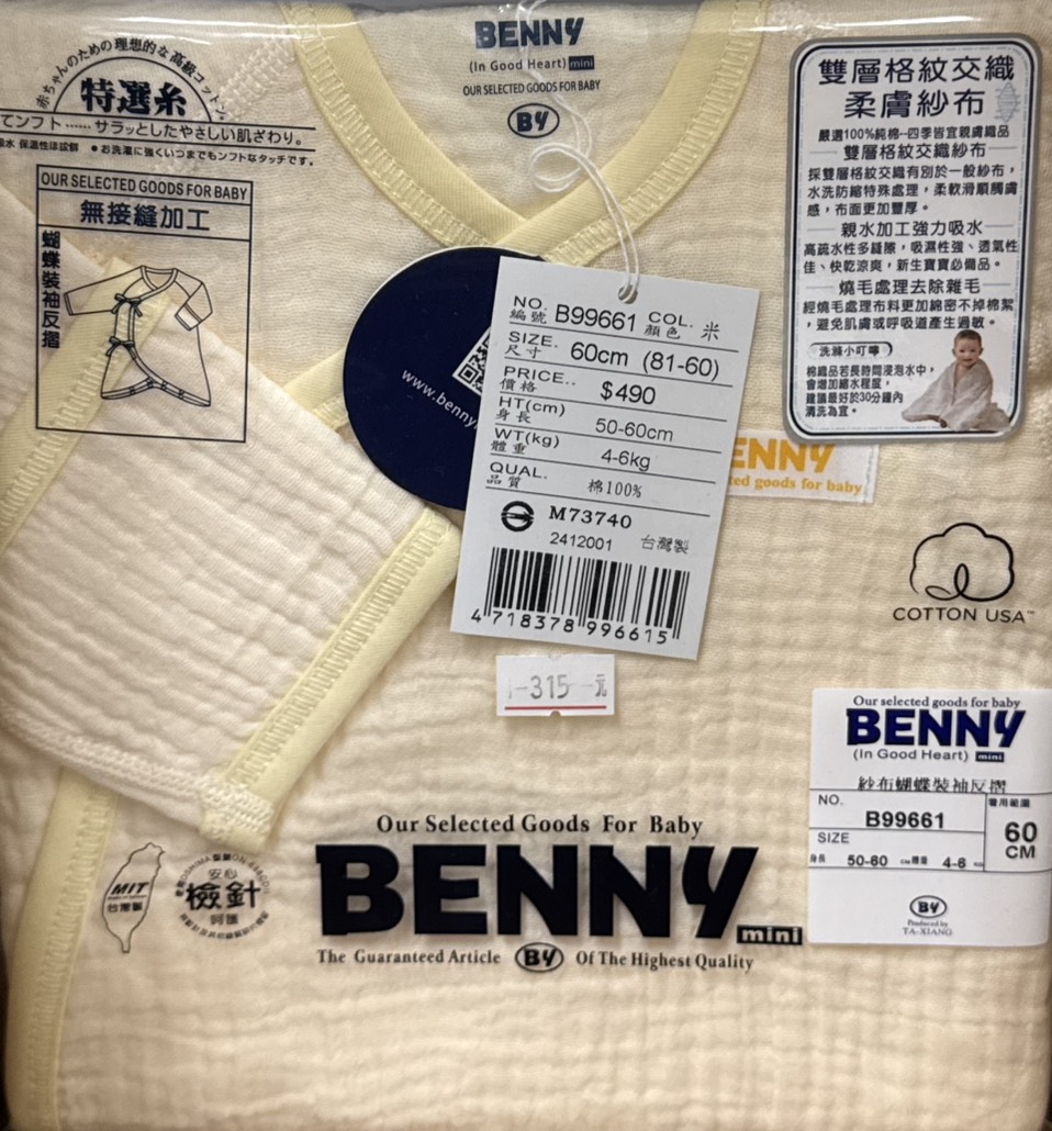 Benny 紗布蝴蝶裝(袖反摺) 皺皺紗 60cm B99661 (黃)