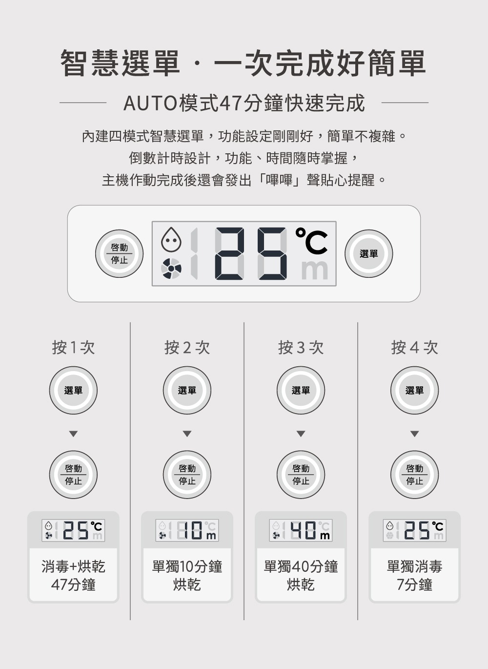 ※四大功能包含消毒+烘乾, 單獨消毒, 單獨烘乾10/40分鐘