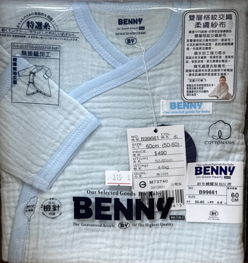 Benny 紗布蝴蝶裝(袖反摺) 皺皺紗 60cm B99661 (水)