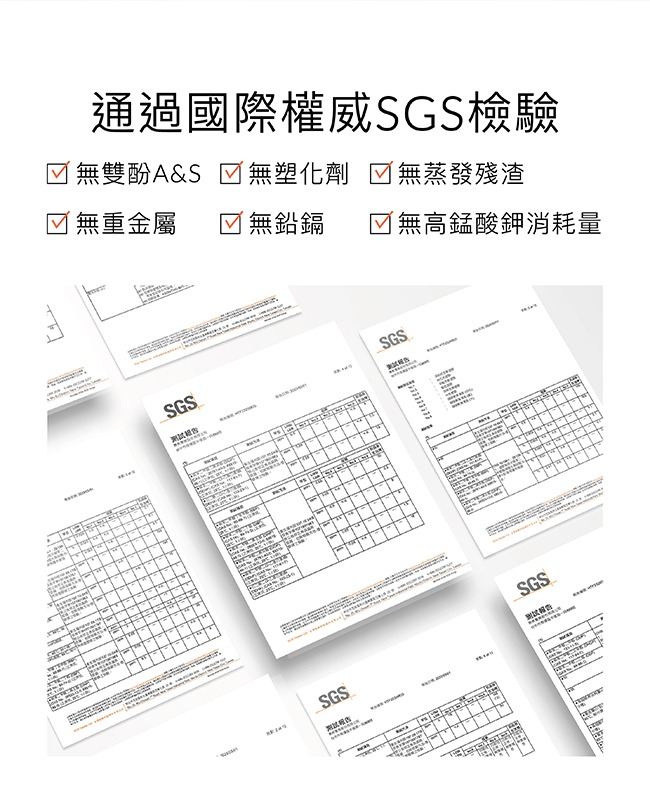 8. 通過國際SGS嚴格檢驗,未檢出雙酚A&S、塑化劑、重金屬、鉛、鎘。