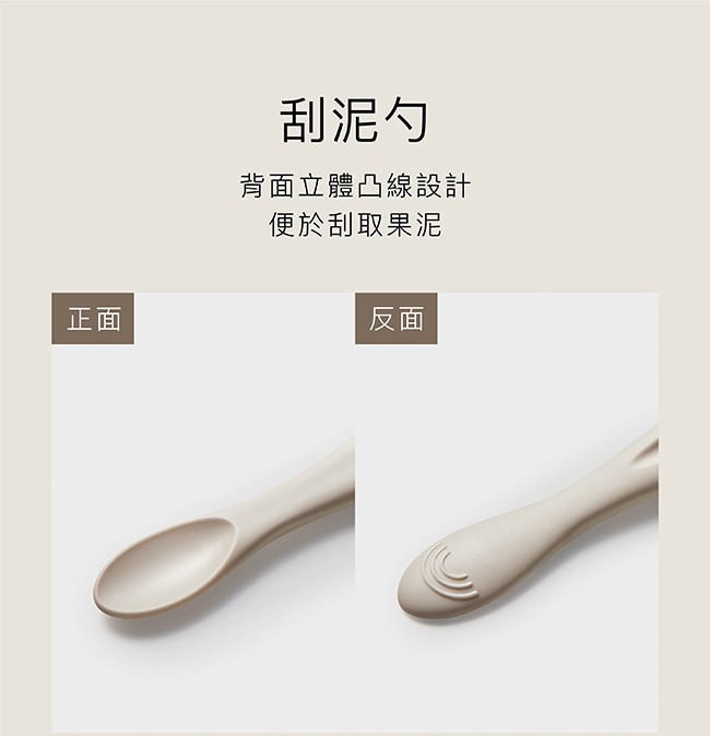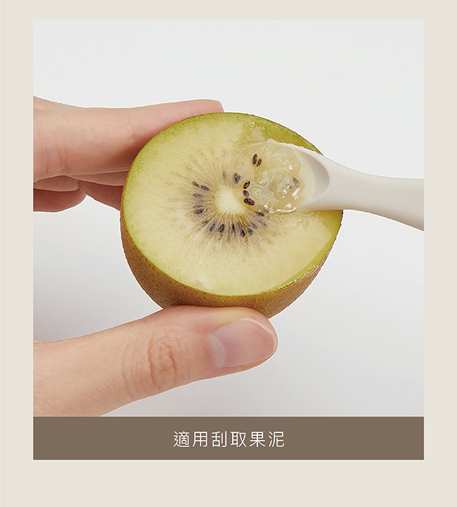 5. 刮泥勺背面立體凸線設計,便於刮取果泥,調理米麥糊等。