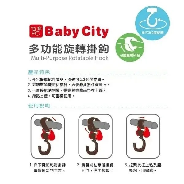 ◎【360度旋轉】旋轉式掛鉤.吊掛物品更加便利 ◎【多種用途】可調式設計.方便繫於推車及桿狀物 ◎【撕黏容易】魔術粘撕黏容易.且可重複使用