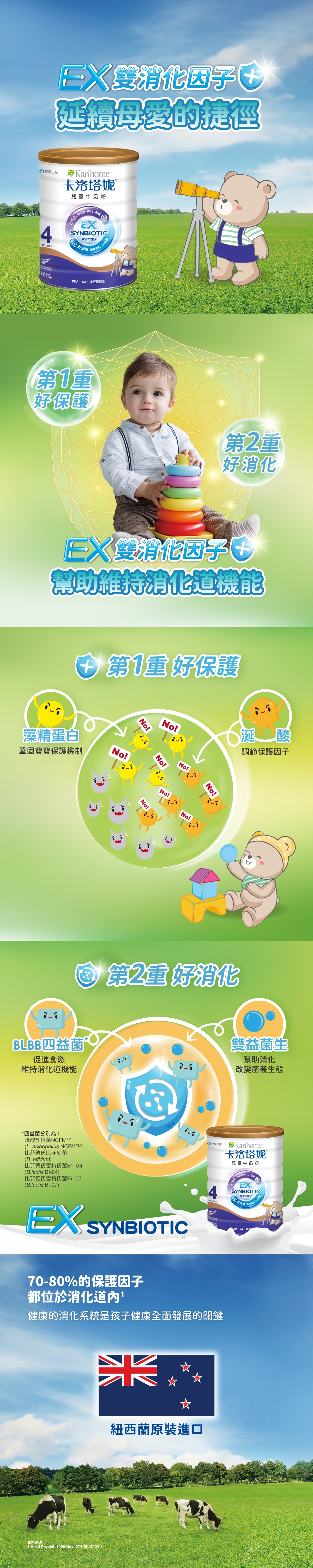 EX雙消化因子 - 四益菌好消化;藻精蛋白好保護,多種關鍵營養幫助寶寶調整體質。 承襲卡洛塔妮天然原態製程理念。 100%紐西蘭原裝進口,給寶寶最珍貴的每一口。