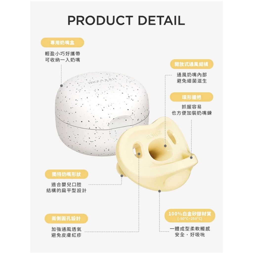-材質:奶嘴(矽膠-50°C~250°C)、奶嘴盒(PP-20°C~110°C)