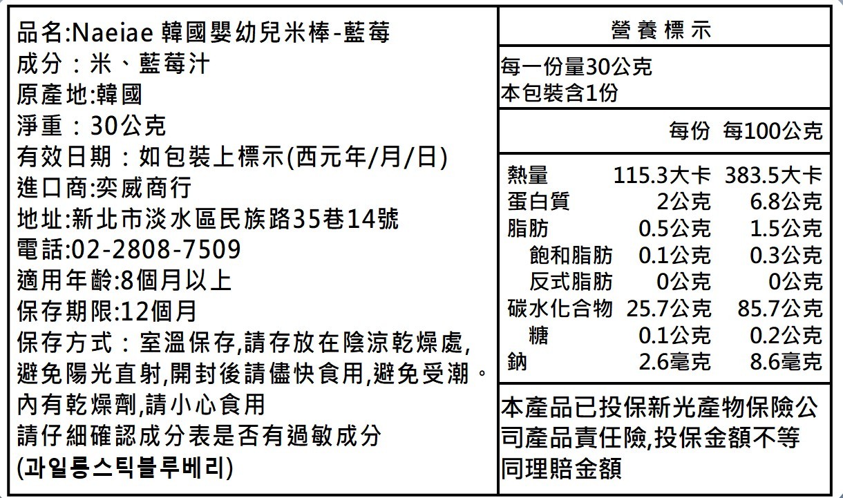 Naeiae 韓國嬰幼兒米棒-藍莓
