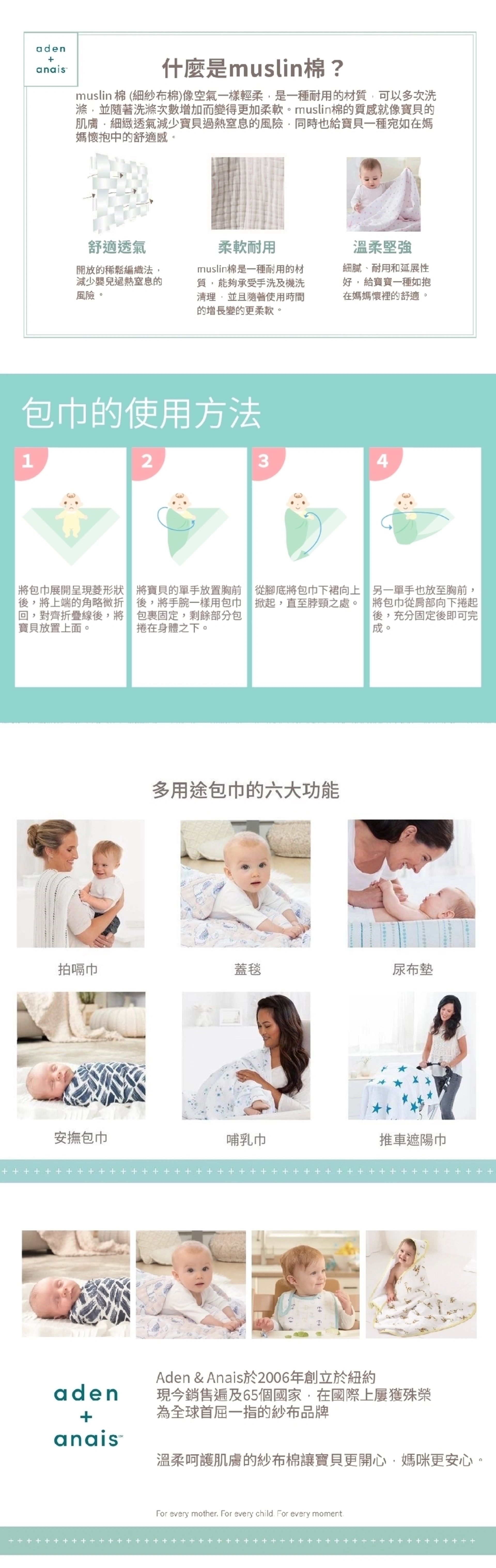 ◎美國品牌aden + anais 經典多功能包巾採用100%muslin細緻輕透紗布棉製成,柔軟透氣