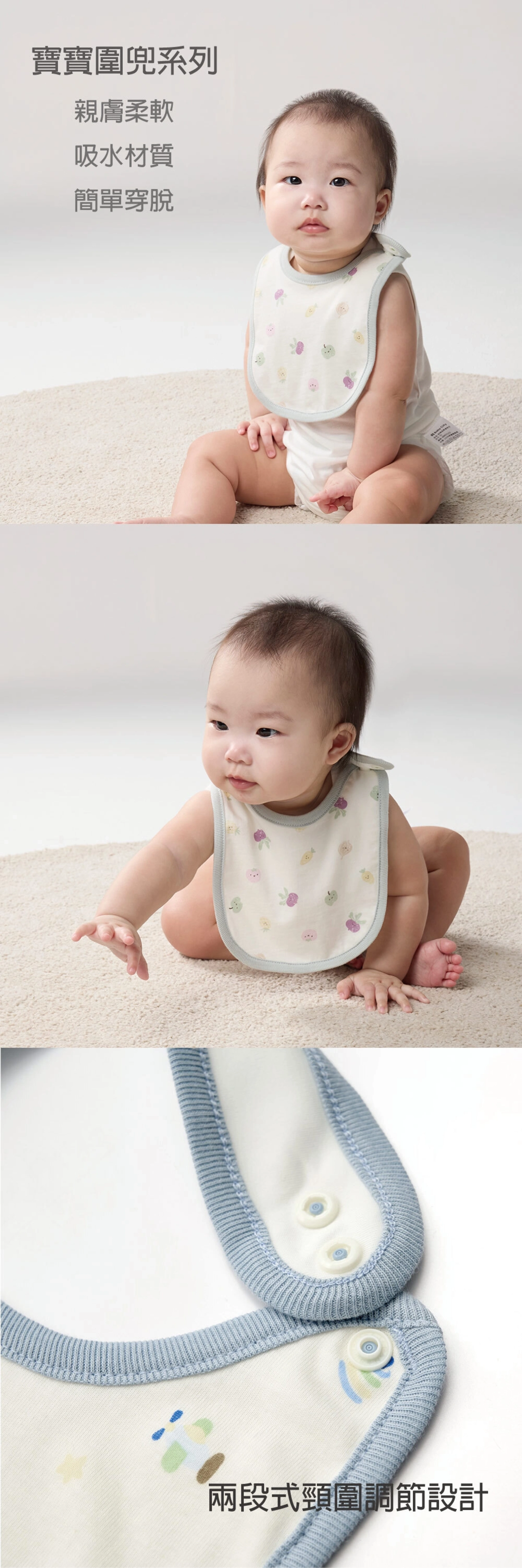 ●貼心兩段式頸圍調節設計,搭配日本進口圓潤塑膠扣,不刮肌膚、不生鏽、不易產生靜電,穿脫更安心。