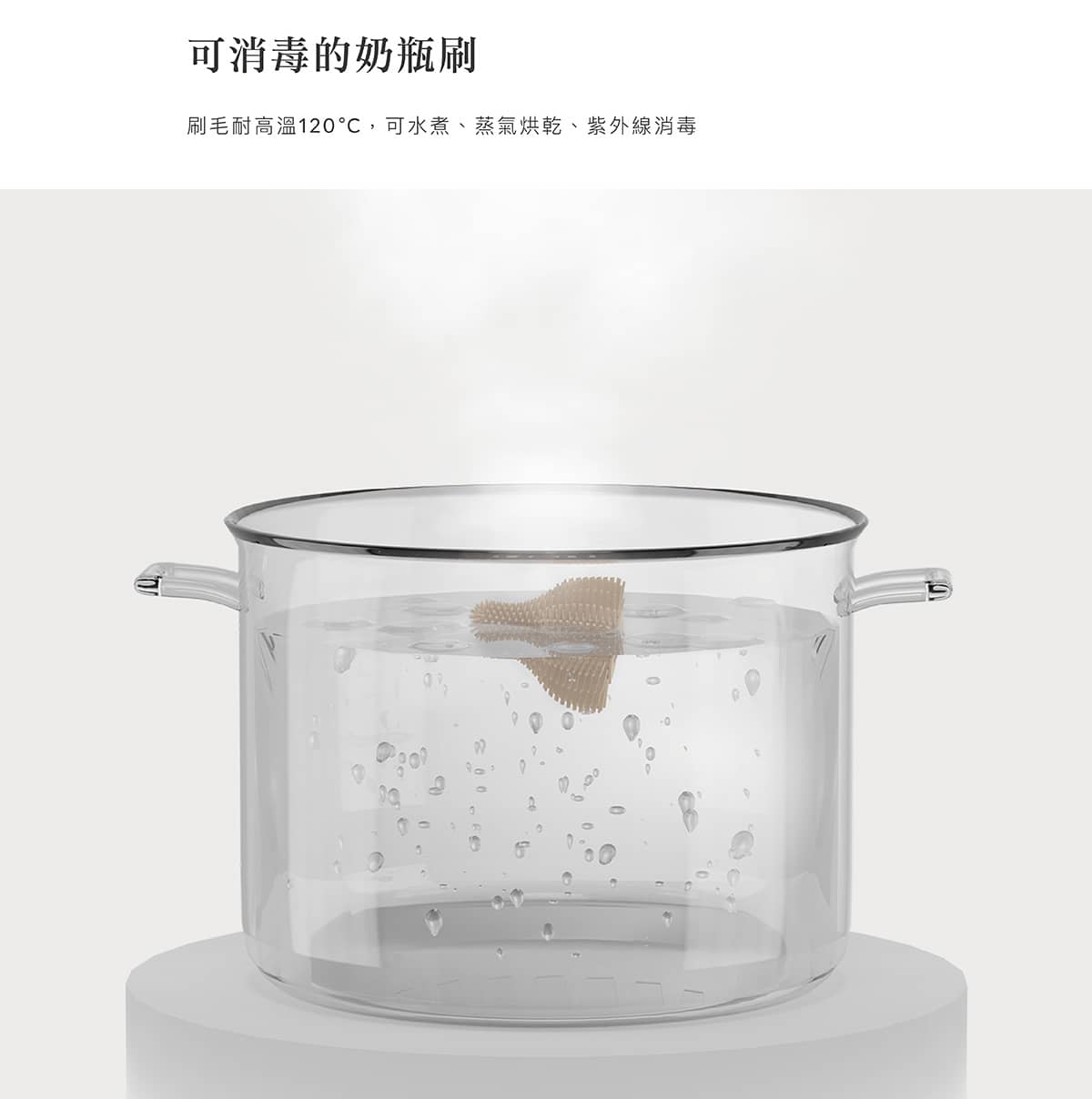 刷毛耐高溫120˚C,可水煮、蒸氣烘乾、紫外線消毒。