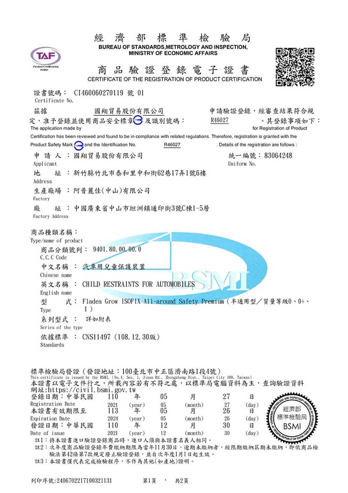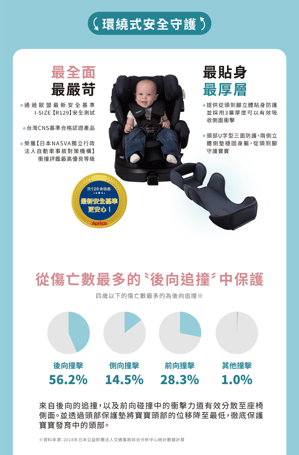 | 安全基準 | 歐盟最新基準I-Size(R129)認證 符合台灣CNS11497安全基準 |